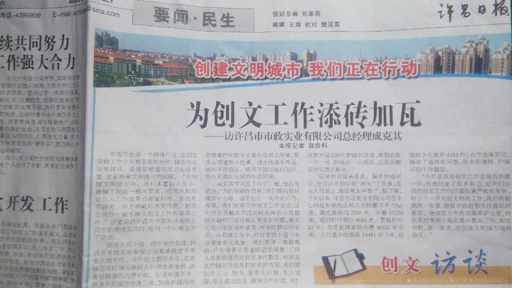 市政行業(yè)是一個(gè)特殊行業(yè),在創(chuàng)文迎檢工作中有著重要的地位。城市市政設(shè)施建設(shè),直接影響著市民的生活質(zhì)量,也影響著文明城市的創(chuàng)建?!霸趧?chuàng)建文明城市中,我們本著以人為本、造福于民這一根本要求,把市民的肯定作為工作成果的衡量標(biāo)準(zhǔn),發(fā)揚(yáng)吃苦耐勞、樂(lè)于奉獻(xiàn)的優(yōu)良傳統(tǒng),把自己當(dāng)作一滴水融入創(chuàng)文工作的海洋之中?!庇浾卟稍L許昌市市政實(shí)業(yè)有限公司總經(jīng)理成克其時(shí),他用一個(gè)比喻拉開(kāi)了話題。