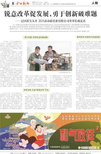 “面向未來、面向外部、面向創(chuàng)新”,這是許昌市市政實業(yè)有限公司的發(fā)展理念,也是成克其個人的座右銘。他將自身的創(chuàng)新意識、好學(xué)精神、吃苦耐勞的品格,注入到企業(yè)發(fā)展的血液中,讓企業(yè)在未來的天地中飛得更快、更高、更遠(yuǎn)!