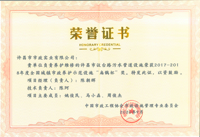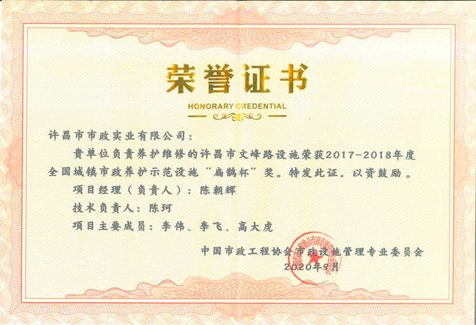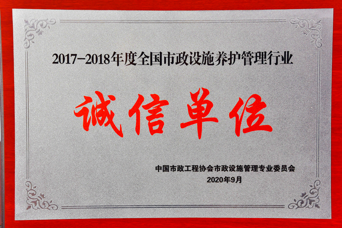 此外,許昌市政集團(tuán)還被評為2017-2018年度“全國市政設(shè)施養(yǎng)護(hù)管理行業(yè)誠信單位”。